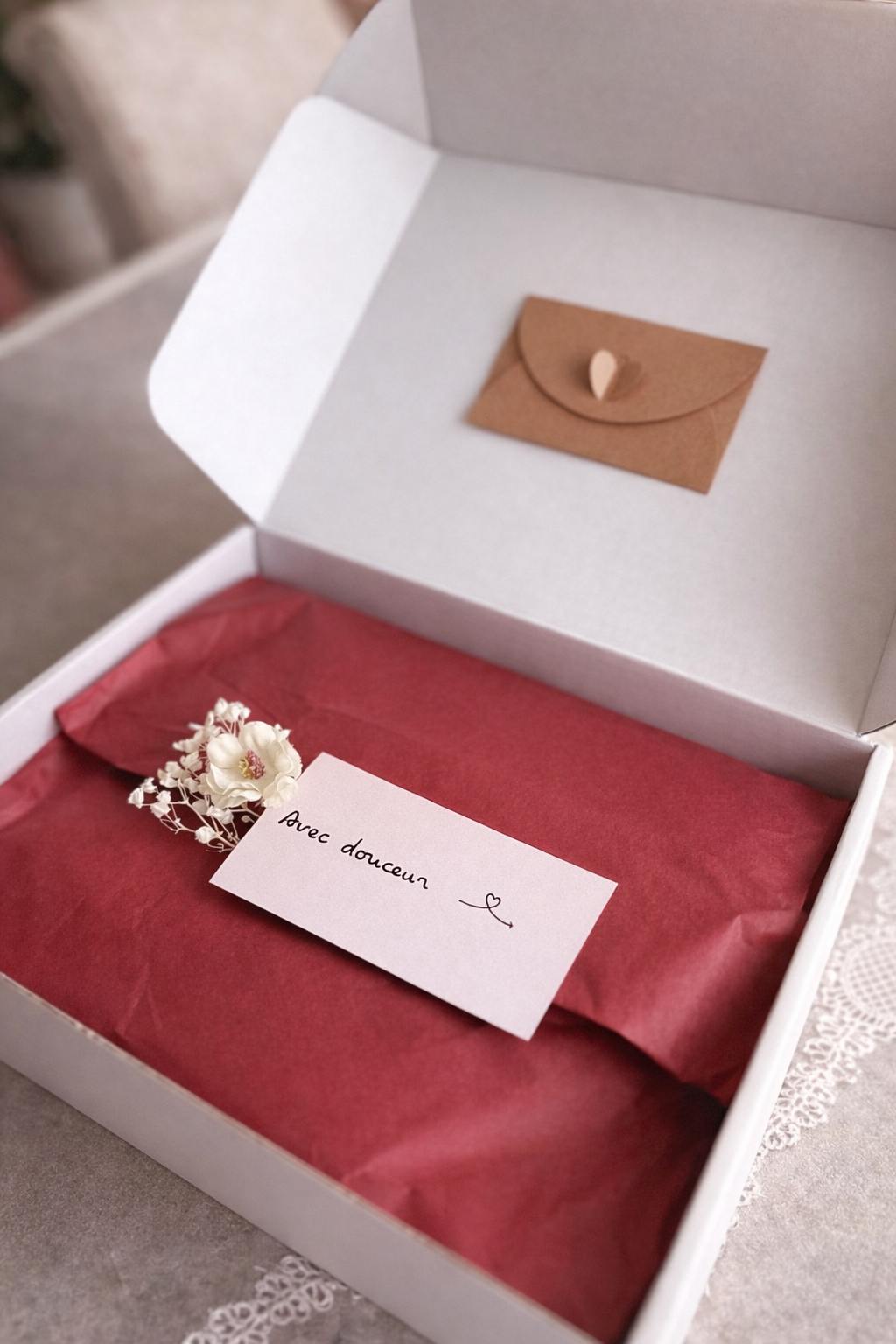 Au cœur de ce coffret se trouve un message.Une carte qu’elle ouvrira dans un moment à elle.